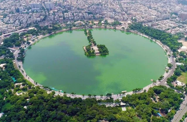 Kankaria Lake is the second largest lake in Ahmedabad, Gujarat, India. It is located in the south-eastern part of the city, in the Maninagar area. It was completed in 1451 during the reign of Sultan Qutb-ud-Din Ahmad Shah II though its origin is placed in the Chaulukya period sometimes. A lakefront is developed around it, which has many public attractions such as a zoo, toy train, kids city, tethered balloon ride, water rides, water park, food stalls, and entertainment facilities. The lakefront was revamped in 2007–2008.
